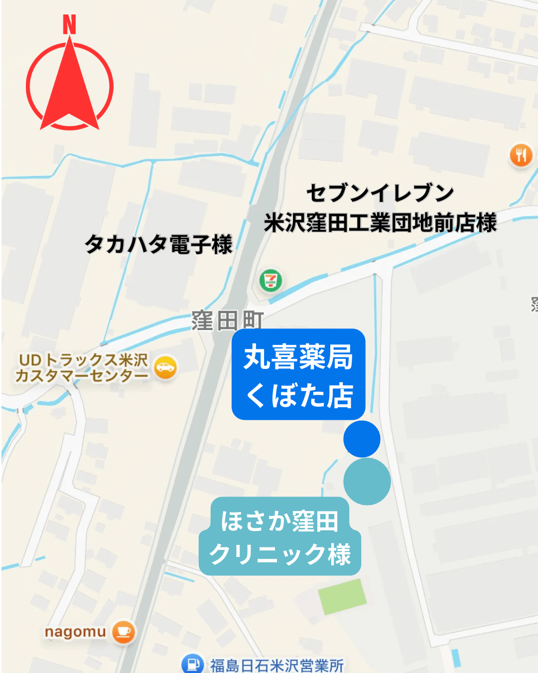 松が岬にある丸喜薬局の駐車場から上杉城址までは徒歩6分の好立地!ダッフィーバスの展示のある伝国の杜まで11分です。